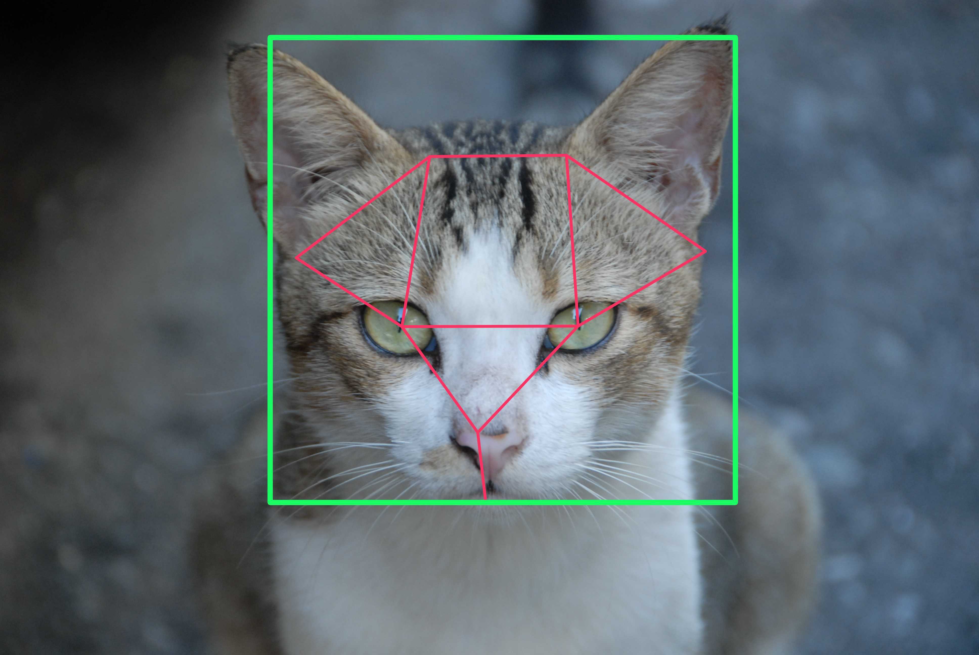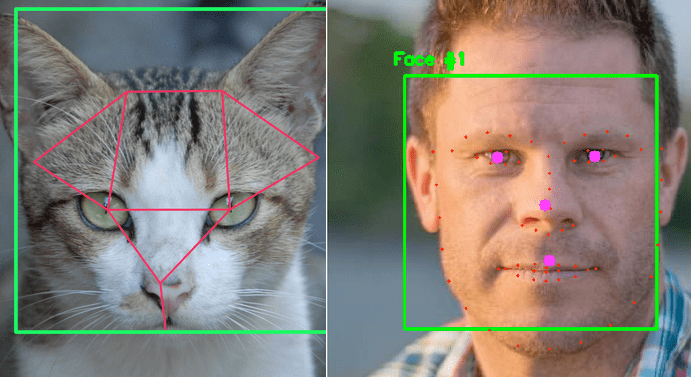 We found the pycatfd repository, which we used to detect landmarks on cat faces. Then we modified an open-source implementation of FaceNet using TensorFlow to extract similar landmarks from a human face.