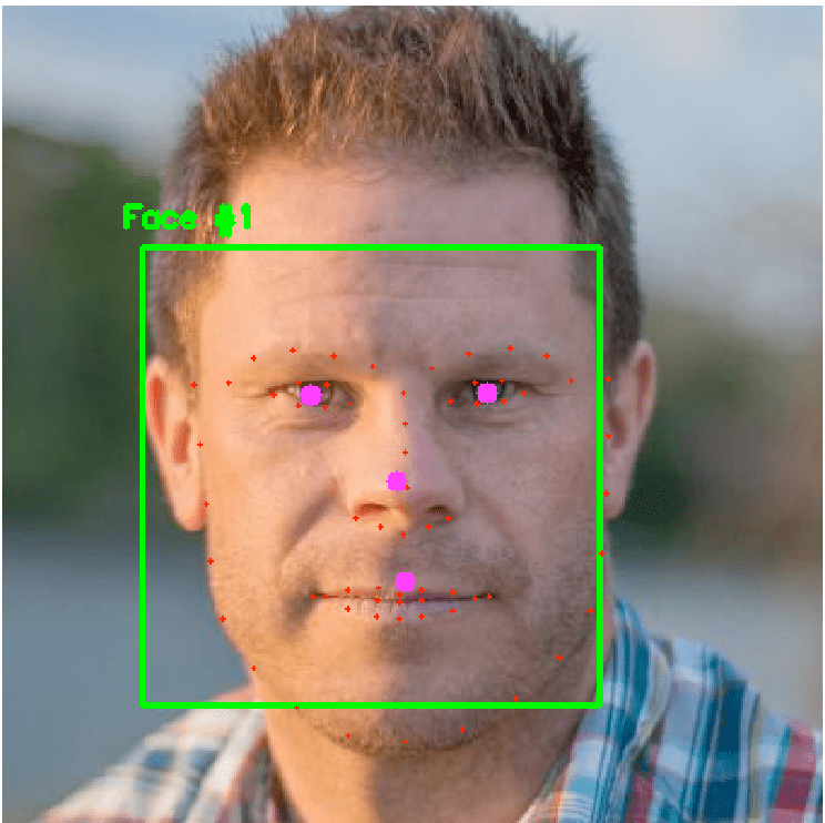 The FaceNet implementation we used extracted much more granular landmarks from human faces. Instead of just 8 landmark locations like pycatfd returns, FaceNet returns a whopping 68.